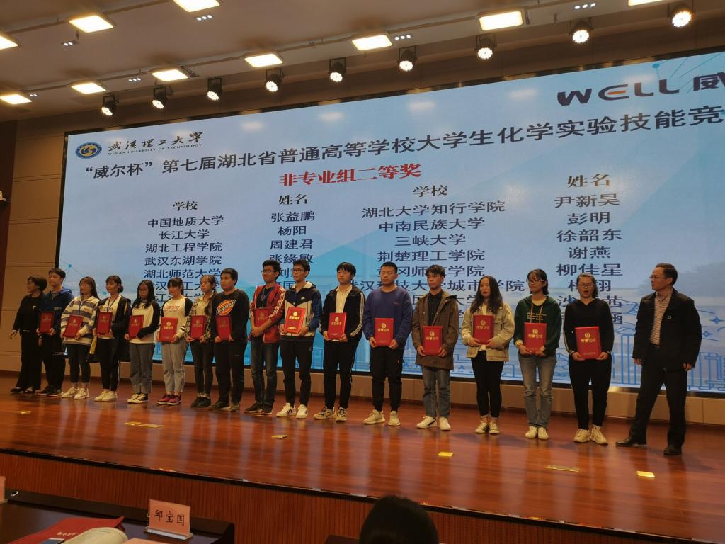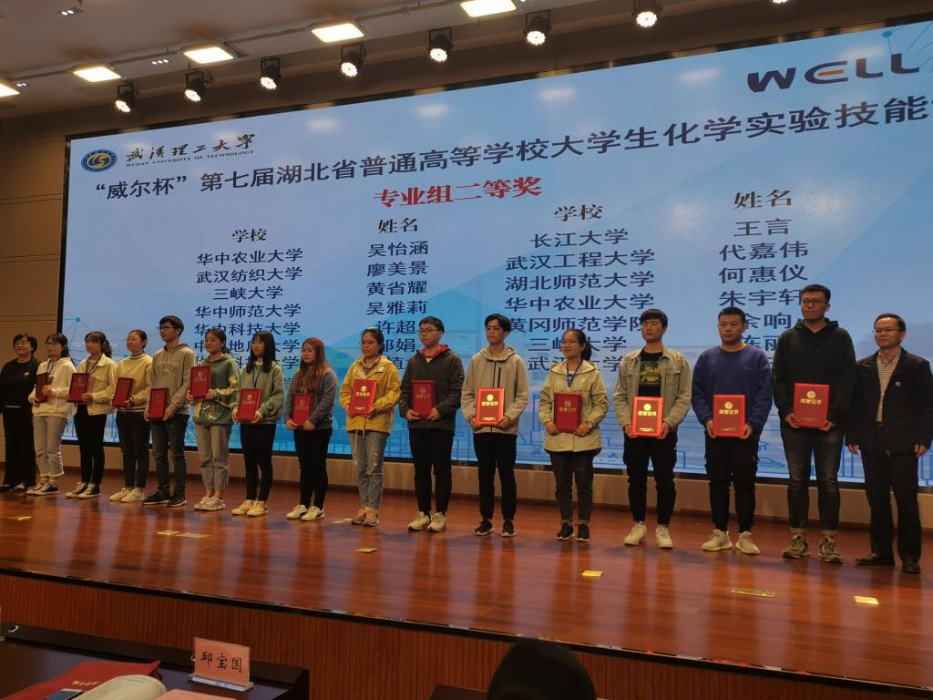 2019年11月8日至10日,第七屆湖北省普通高等學(xué)校大學(xué)生化學(xué)實驗技能競賽在武漢理工大學(xué)舉行。來自湖北省37所高校,近240名化學(xué)及近化學(xué)專業(yè)的本科生、100余名大學(xué)化學(xué)教師齊聚南湖之濱,參加本次大賽。我校材料與化學(xué)學(xué)院學(xué)子何華威、鄒娟、陳爍汀、佘思雨、張益鵬、劉天樂六名同學(xué)組建了化學(xué)專業(yè)隊以及非專業(yè)隊兩支隊伍,前往武漢理工大學(xué)進行為期兩天的激烈比賽。經(jīng)過實驗操作與理論考試,何華威、劉天樂分別獲專業(yè)、非專業(yè)隊一等獎,鄒娟、張益鵬分別獲專業(yè)、非專業(yè)隊二等獎。