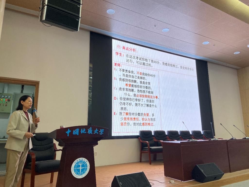 郭蘭講話,以如何更好的實(shí)現(xiàn)師生溝通為主題做了深入淺出的講解。她分享了與學(xué)生進(jìn)行有效溝通、對(duì)話的方式、方法以及原則。她著重指出,溝通一定本著真誠(chéng)原則,要客觀看待學(xué)生個(gè)人特點(diǎn),挖掘個(gè)人積極正向的資源,建立平等互動(dòng)的對(duì)話關(guān)系,積極引導(dǎo)學(xué)生自主解決問題;要理解青年學(xué)生需要被欣賞、被肯定的心理,要善于發(fā)現(xiàn)學(xué)生的優(yōu)勢(shì)、資源與力量,促進(jìn)健康成長(zhǎng)。