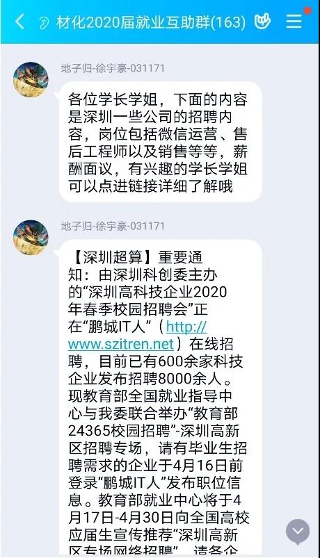截至目前,已有近50位校友提供了約140個(gè)就業(yè)崗位信息,有60余位畢業(yè)生聯(lián)系應(yīng)聘,部分已成功簽約。