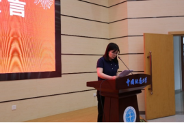 高年級研究生代表、2021級碩士研究生馬瑞奇同學發(fā)言。他結合自己的求學經歷,以“目標、堅持、品性、情義”四個主題與大家共勉,希望和大家一起在實踐中砥礪品格、強化本領,努力成為可堪大用、能負重任的地大材化青年。