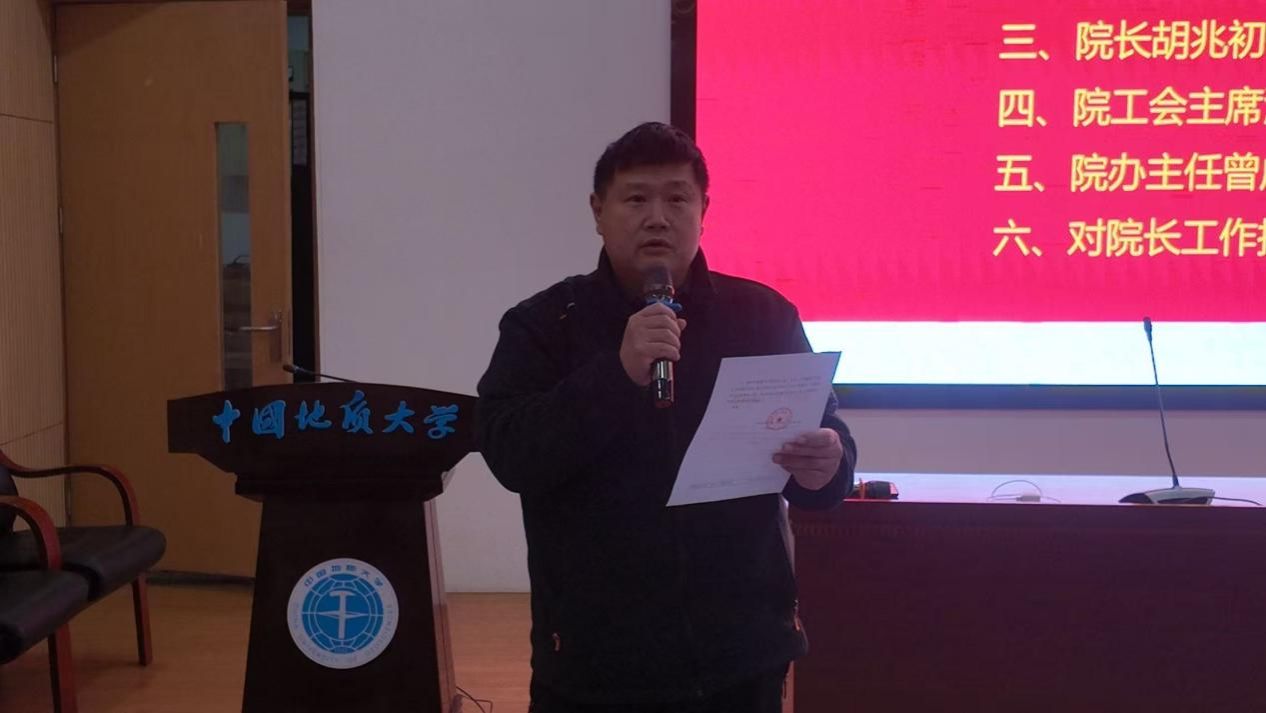 學(xué)院分工會(huì)主席沈毅宣讀學(xué)校工會(huì)《關(guān)于同意召開(kāi)材化學(xué)院第四屆教職工大會(huì)第二次會(huì)議暨第四屆工會(huì)會(huì)員大會(huì)第二次會(huì)議的批復(fù)》,并傳達(dá)學(xué)校工會(huì)對(duì)材化學(xué)院教職工的殷切希望。